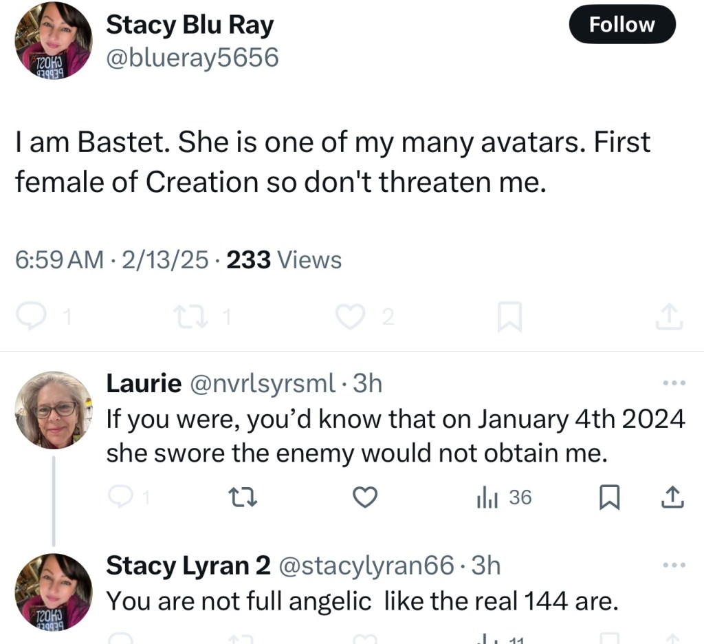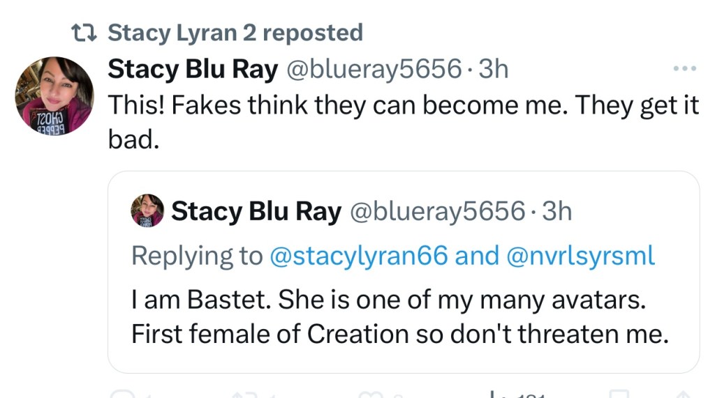 The dark witches who do mental magic are getting to those who have substance abuse issues. This one believes she is a queen, and accusing me of wanting to be her. (She has pretty much claimed every persona from the Egyptian days on forward, and even prior. She is everyone, and anyone who claims to be anyone at all, she believes they are trying to steal ownership of one of her “avatars”.)