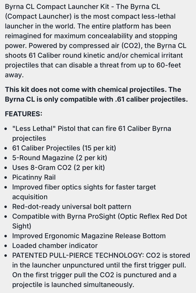 Non-lethal Self Defense Published September 22, 2025 by tindertender https://www.sportsmans.com/personal-protection/launchers-accessories/launchers/byrna-cl-compact-launcher-kit/p/p319696 Share this: Click to email a link to a friend (Opens in new window) Email Click to share on Facebook (Opens in new window) Facebook Click to print (Opens in new window) Print Click to share on Tumblr (Opens in new window) Tumblr Click to share on X (Opens in new window) X Click to share on Pinterest (Opens in new window) Pinterest Click to share on Reddit (Opens in new window) Reddit Like Loading... Related