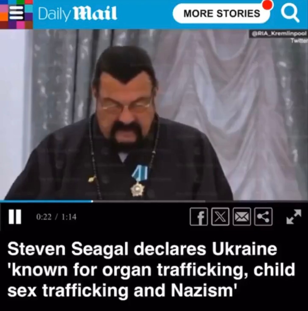 Steven Seagal: “Ukraine was known for human trafficking, organ trafficking, narco trafficking, child sex trafficking, biochemical warfare labs, fascism and Nazism.”