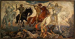 The Four Horsemen of the Apocalypse, as described in the Book of Revelation, are four biblical figures who appear upon the unsealing of the first four of the seven seals. They are widely interpreted as representing Conquest, War, Famine, and Death.