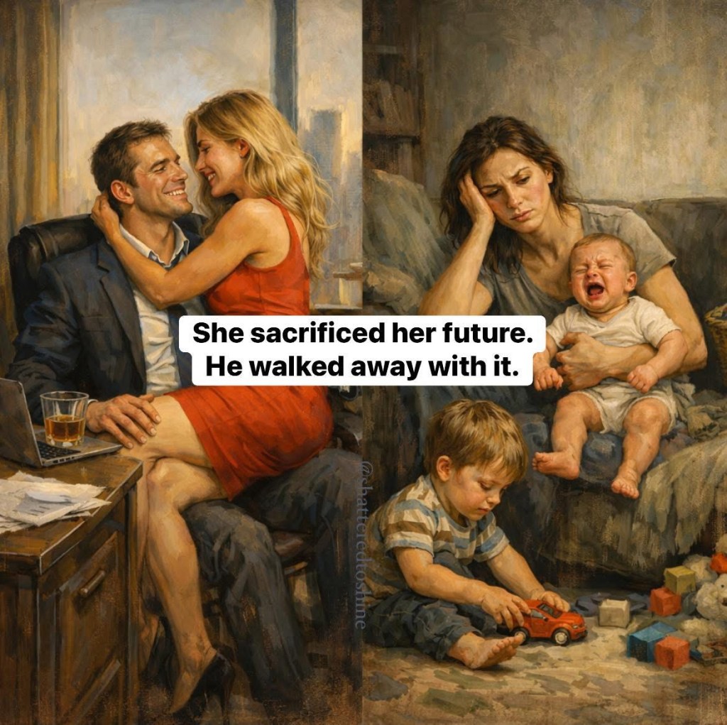 She gives ten or twenty years raising children, running a household, carrying the emotional load, and holding everything together. Her career pauses so the family survives.