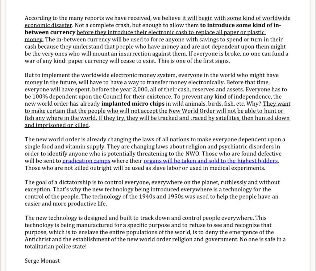 According to Monast, the plan would unfold in four major steps using advanced technology to deceive and control the world’s population:
