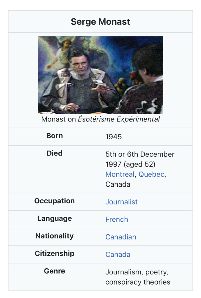 Serge Monast died in 1996, at the age of 51, from a heart attack. Many of his followers claim his death was suspicious, allegedly a result of being a target of the very conspiracy he revealed. His death, along with others who promoted conspiracy theories, has become another supposed “proof” for proponents of the theory.