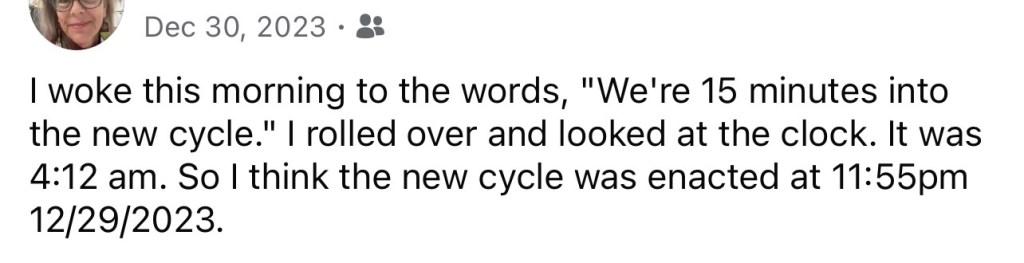 January 1st, 2015, I received message, “Eight years will go by quickly.” December 2023, this message was received. Apparently, my math wasn’t computing, lol.