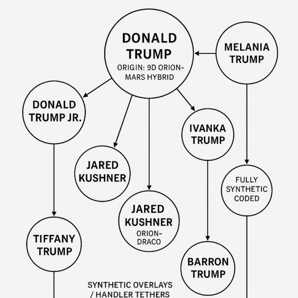 The Soul Arc Summary • Original Seed: Engineered for influence, not liberation. • Current State: Fragmented organic remnant, majority synthetic overlay. • Children’s Roles: Ivanka & Jared as global Zionist-elite bridge; Don Jr. as “man of the people” voice; Barron as next-gen synthetic anchor. • Cosmic Placement: In the 3D/4D theater, framed as savior or villain depending on the audience but in the Organic Edenic timeline, he is not a steward of restoration.